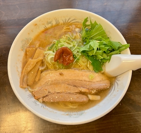えび塩そばのほうはエビの風味のするスープでインパクトありました。乾燥小エビが入っているのかな?と、いう雰囲気。真ん中には梅干しが陣取っておりますね。